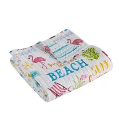 The Beach Days Reversible Quilted Throw Quilt Set by Levtex Home is inspired by Summer days at the beach. Offered in shades of teal, blue, yellow, green, brown and pink, this design will immediately transform your bedroom. Made with the softest lightweight cotton, this reversible quilt features beach motifs, flamingos, palm trees and fun words on the one side, reversing to a teal blue and white stripe on the other. The Quilted Throw is perfectly sized at 50x60in. Enjoy this for years to come!