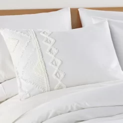 - THE HARLESON DESIGN: One of our most popular sets, Harleson is hip, dimensional and contemporary. The front is a tufted and frayed cream bohemian pattern on white and the reverse is solid white 100% cotton. Button closures at the bottom of the duvet cover are durable and easy to use.