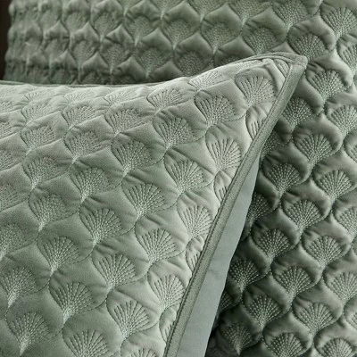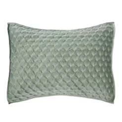 The Merano Quilted Standard Sham by Levtex Home is inspired by an updated take on a traditional fabrication. Offered in seafoam green, this design will immediately transform your bedroom. These shams feature soft, luxurious green velvet quilted in a gorgeous scalloped leaf pattern on the front, reversing to a matching microfiber on the back. The Standard Sham (26x20in.) is microfiber, quilted with a soft hypo-allergenic polyester filler and is machine washable. Pillow inner not included. Enjoy this for years to come!