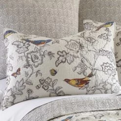 - LEVTEX MOCKINGBIRD QUILT BED SET: A traditional grey floral toile with birds and butterflies in blues, greys, yellows and rusts. This bedding set consists of a quilt and matching pillow shams. Used by itself, as a layering piece or as a bedspread, this bedding set is extremely versatile.
