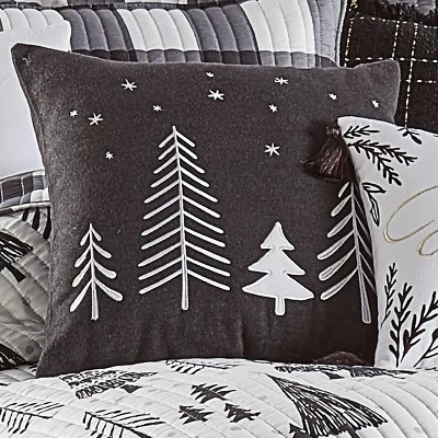 The Black and White Trees decorative pillow matches perfectly with the Levtex Home Northern Star bedding collection or can be used to bring the holiday spriit into any room in your home. This pillow is sized at 18x18in. and features appliqued and embroidered Christmas trees in black against a crisp white ground set off by twinkling Christmas stars above. A versatile accessory for your bed, couch or favorite chair. The pillows comes pre-filled with a soft luxurious feather inner. Bring the holidays home!