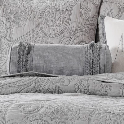 The Neckroll decorative pillow matches perfectly with the Levtex Home Perla bedding collection. This pillow is sized at 7 x 18in. and features intricately detailed tassel trim appliques create dimensional borders on this gorgeous grey neckroll. The color palette makes this a versatile accessory for your bed, couch or favorite chair. The pilow comes pre-filled with a soft. luxurious feather inner.