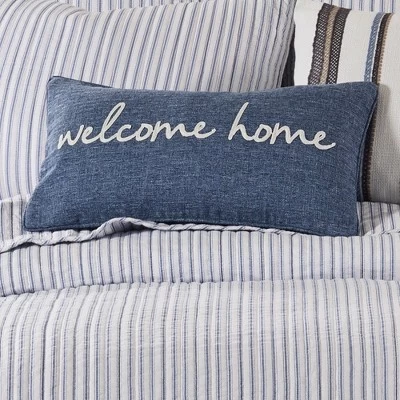 The Welcome Home decorative pillow matches perfectly with the Levtex Home Tobago bedding collection. This pillow is sized at 12 x 24 in. and features beautiful embroidered stitched words on blue ground. The color palette makes this a versatile accessory for your bed, couch or favorite chair. The pilow comes pre-filled with a soft. luxurious feather inner.