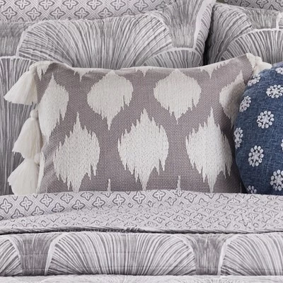 The Grey Tassel decorative pillow matches perfectly with the Levtex Home Wexford bedding collection. This pillow is sized at 14x18in. and features white bohemian ornaments embroidered on a grey textured ground. The white and grey color palette makes this a versatile accessory for your bed, couch or favorite chair. The pillow comes pre-filled with a soft, luxurious feather inner.
