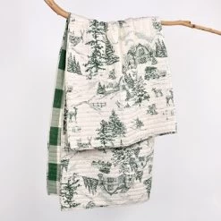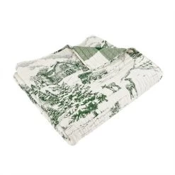 Add a festive touch to any space with the Levtex Home Winter Sleigh Ride Throw. Sized at 50x60in., this cozy accent features a charming toile print of sleighs, barns, deer, and pine trees on a soft white ground. Made from 100% cotton with a cotton-rich fill (that includes cotton, polyester and other fibers), it’s the perfect layer for holiday lounging. The reverse reveals a coordinating plaid, offering two seasonal looks in one warm and inviting throw.